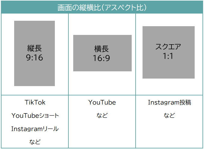 Massetsでは「縦長(9:16)」「横長(16:9)」「スクエア(1:1)」の3種類ご用意しています。「16:9」など、数字で表す画像や動画の縦横比を「アスペクト比」といいます。